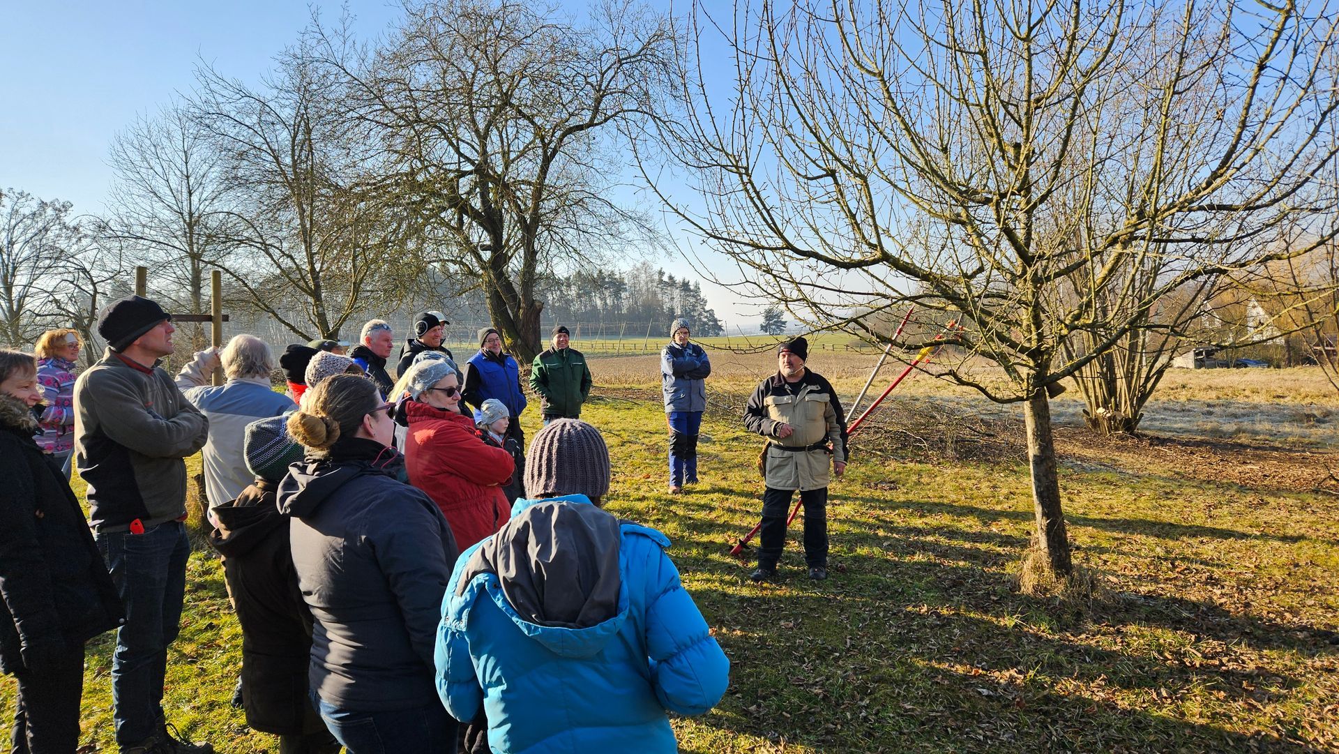 Wenn sich jemand auskennt mit dem Schnitt von Obstbäumen, dann ist es Jürgen Pompe, Pomologe, Lohnmoster und Herr über rund 600 Obstbäume auf der heimischen Wiese im niederbayerischen Neufahrn. Ihn hatten die Rohrbacher Gartler zum Obstbaumschnittkurs Anfang Februar nach Burgstall eingeladen, wo sich zwei junge Vereinsmitglieder seit einigen Jahren einer alten Streuobstwiese annehmen. Damit der – für die Teilnehmer übrigens kostenfreie – Kurs nicht zu groß wurde, begrenzten die Gartler die Teilnehmerzahl auf 20. Angenehmer Effekt: Alle waren mit großem Interesse dabei und die aufmerksame Gruppe konnte richtig viel lernen.