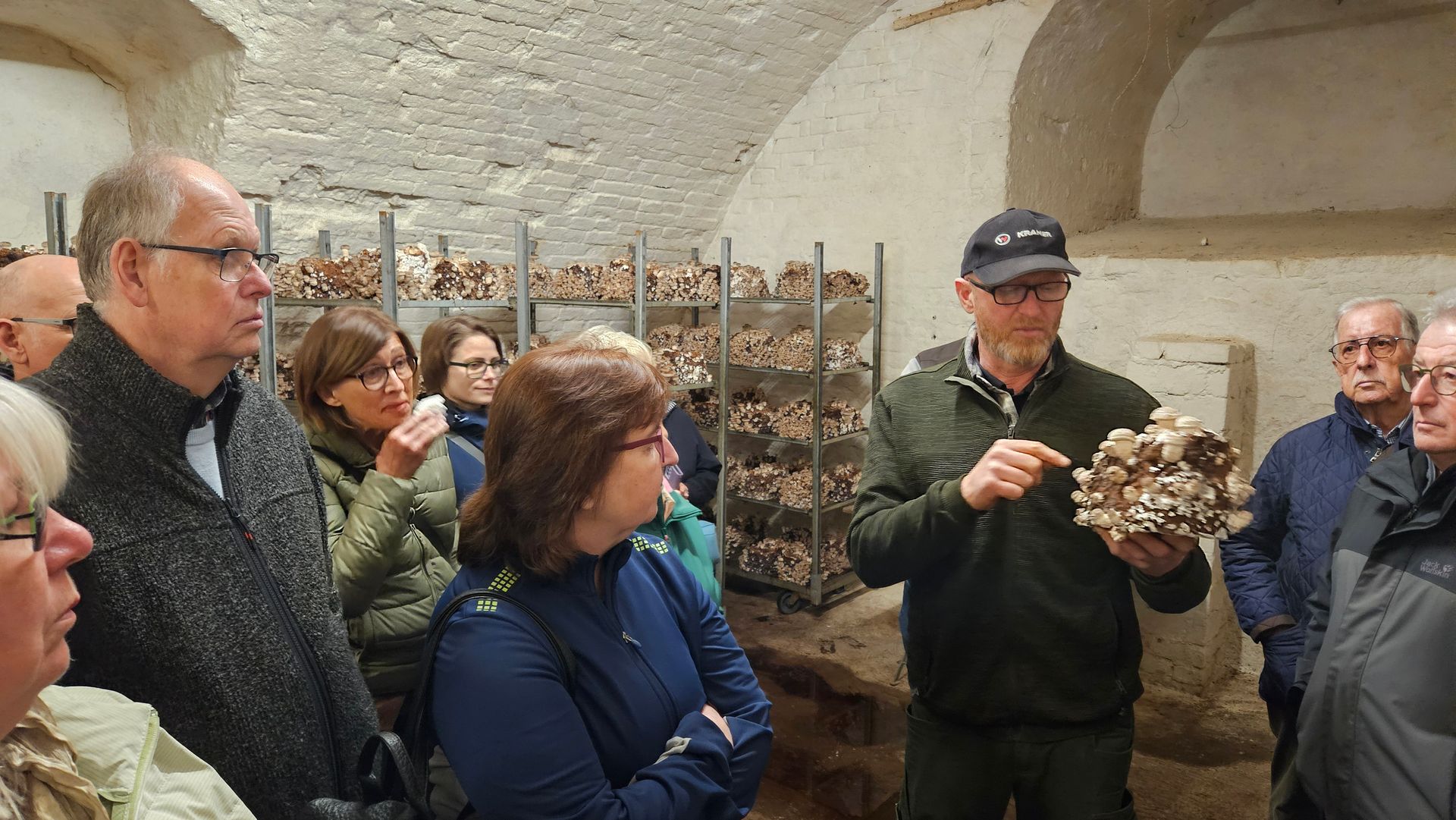 Produktionshallen für weiße und braune Champignons bekam man auch die alten Gewölbekeller aus dem 18. Jahrhundert zu sehen. Dort bringt Franz Ulrich Spezialitäten wie Shiitake, Kräuterseitlinge oder den Igelstachelbart zum Wachsen. Und obwohl die Pilzzucht Ulrich nur eine ganz kleine Pilzzucht in Deutschland ist (mit 5 Tonnen Champignons pro Woche, die hauptsächlich am Großmarkt in München ihre Abnehmer finden), war die Führung eine ganz große Sache. So mancher nutzte am Ende dann auch die Möglichkeit zum Einkauf frischer Pilze.