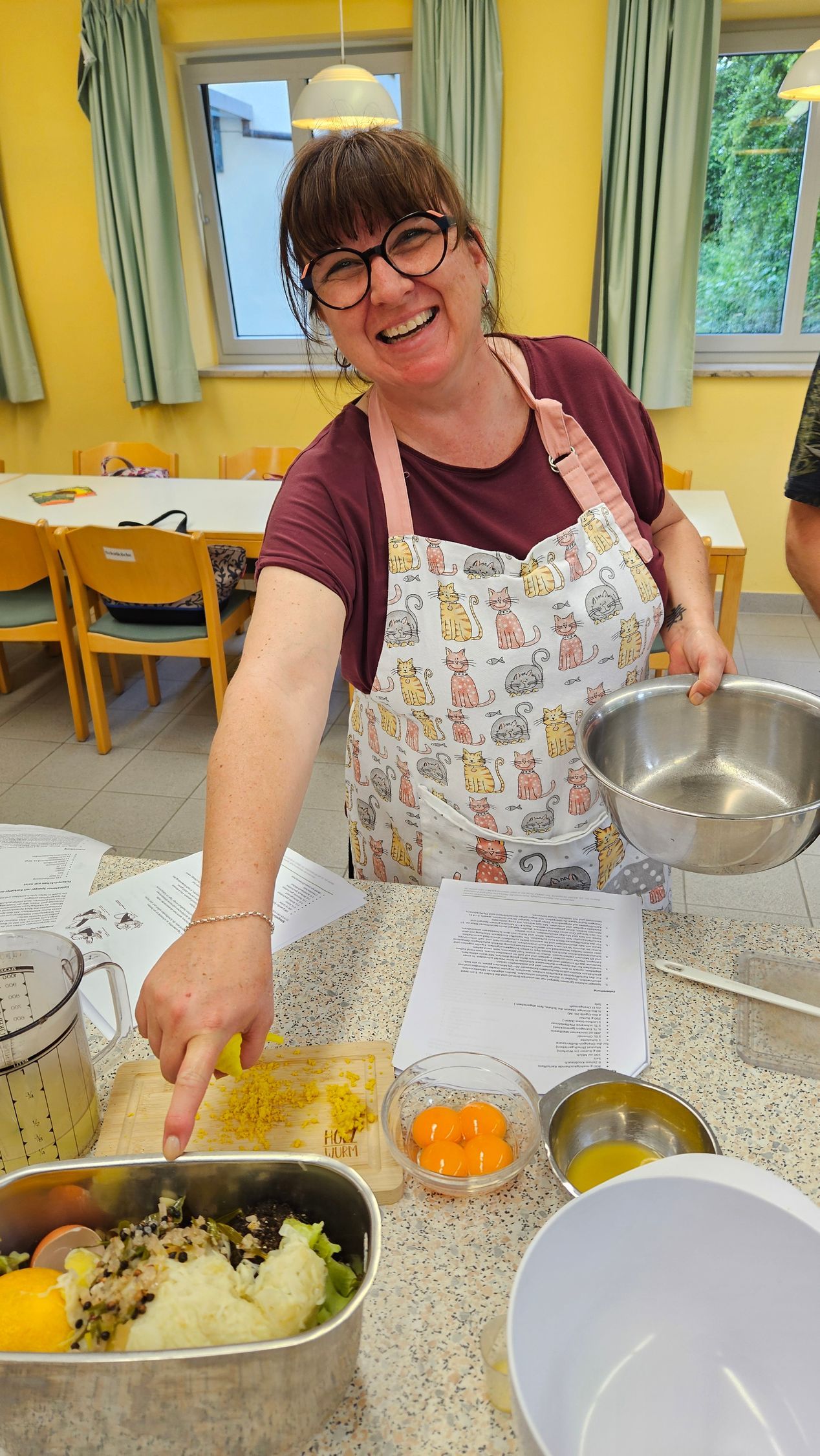 Sehr gut kam der erste Termin der beiden Ostermenü-Kochkurse an, der Anfang Februar mit 14 Teilnehmern in der Rohrbacher Schulküche stattfand. Die Gerichte: Kressesuppe mit Lachs, Gefüllte Hähnchenbrust mit Kartoffel-Radieschen-Carpaccio, Gelbe-Rüben-Lasagne und zum Schluss österliches Hefegebäck sowie ein Eierlikör-Tiramisu. Für den zweiten Termin am 20. März sind noch wenige Plätze frei, natürlich dürfen auch Nichtmitglieder mitmachen. Die Kosten betragen 15,- EUR zzgl. Lebensmittelkosten (beim ersten Kurs kam man so auf insgesamt 25,- EUR pro Person).