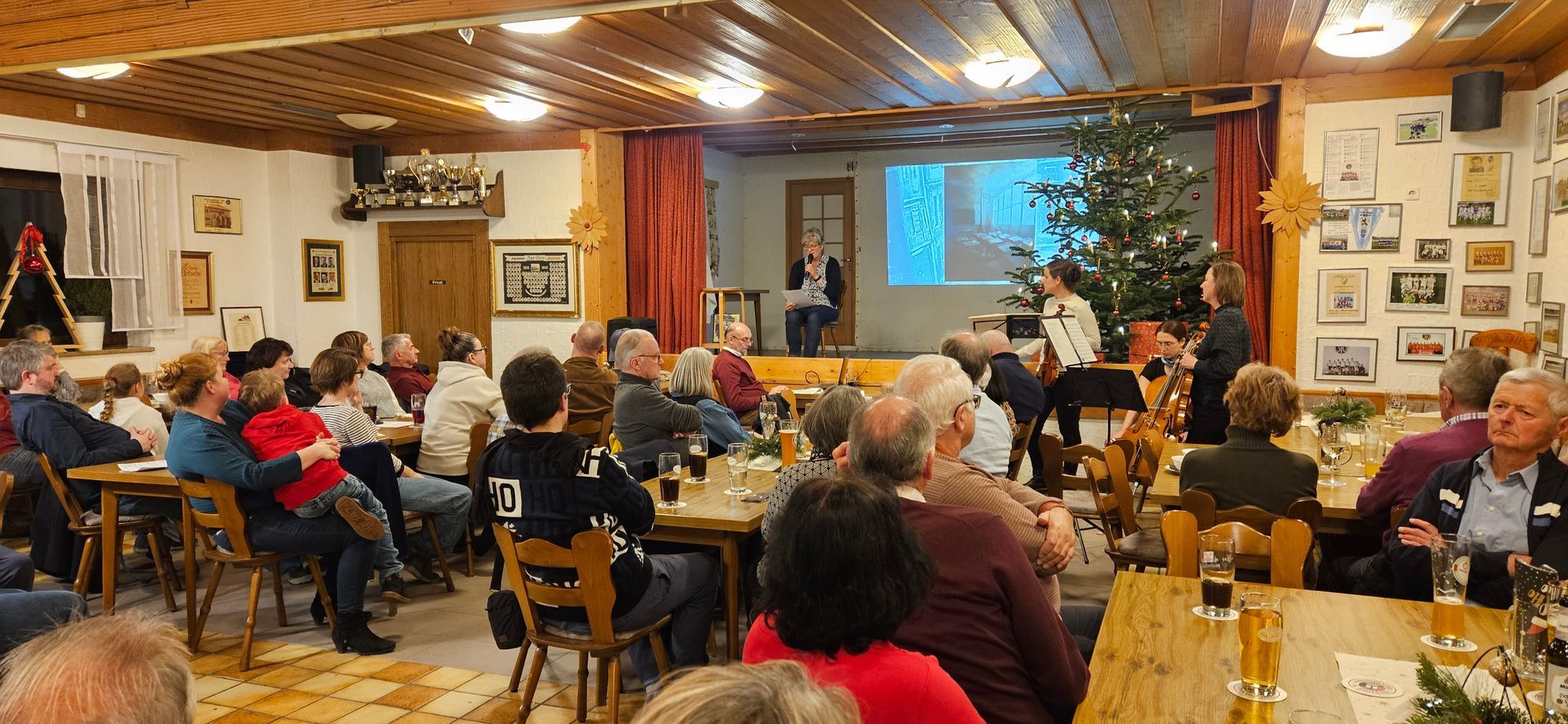 Im Anschluss an das gemeinsame Abendessen im Sportheim Fahlenbach erläuterte Anne Fishburn die Entstehung von „A Christmas Carol“. Mitte des 19. Jahrhunderts herrschten in England Armut und Elend auf der einen und Reichtum und Ausbeutung auf der anderen Seite. Wie mit Hilfe von drei Weihnachtsgeistern die Wandlung der geizigen Hauptfigur Ebenezer Scrooge zum gütigen Menschen gelingt, ist Kern des zeitlosen Märchens. Gekonnt las Claudia Gabriel mehrere Passagen aus der Erzählung. Musikalisch unterstützt wurde sie von Michaela Merkl, Vroni Oberhauser (beide Geige) und Verena Häusler (Cello), die zusammen „Mamusika“ sind. Die drei steuerten passende traditionelle englische Weihnachtslieder bei.