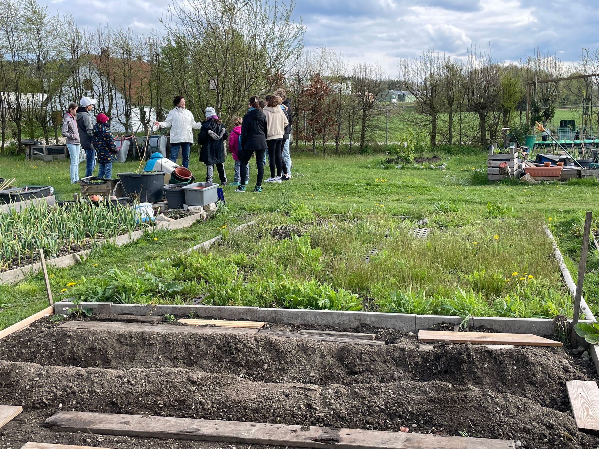 Vor Kurzem gärtnerte die Gruppenstunde der katholischen Kirche mit Helga Widmann nach dem Motto "Schöpfung zum Anfassen" im Gemeinschaftsgarten. Es wurden Kartoffeln gesteckt, Erdbeeren gepflanzt und ein kleiner Blühstreifen angesät. Anschließend pflückte man Pfefferminze für einen Tee zum Aufwärmen.