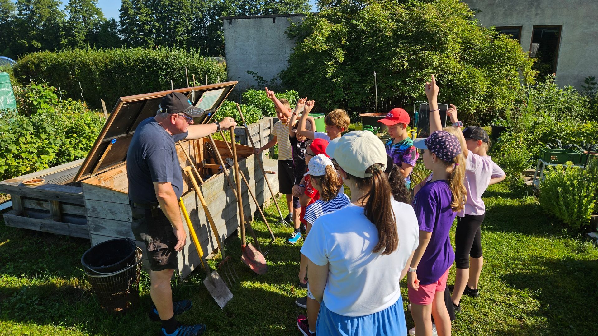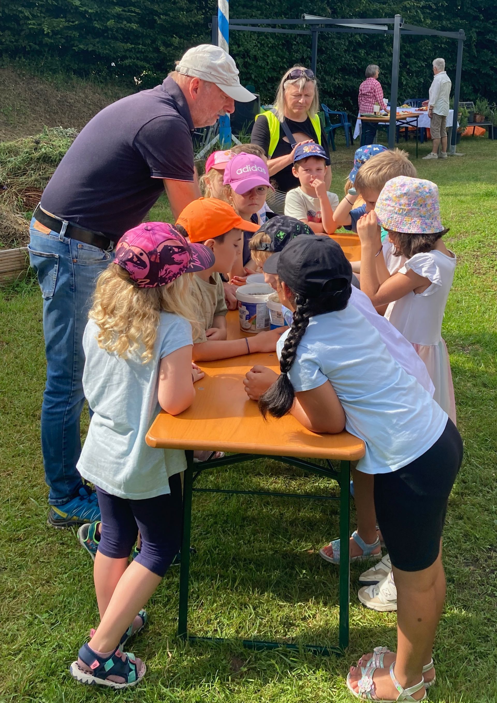 Gestartet wurde mit einer Führung durch den weitläufigen, zertifizierten Naturgarten. Die Kinder hatten die Möglichkeit, verschiedene Beete mit den unterschiedlichsten Pflanzen zu bestaunen. Die Hobbygärtner erklärten ihnen die verschiedenen Wachstumsstadien der Pflanzen und beantworteten geduldig die vielen neugierigen Fragen der kleinen Besucher. Die Kinder waren fasziniert von gelben Tomaten, langen Gurken und großen Kürbissen. Sie lernten, wie die Pflanzen wachsen und was sie brauchen, um groß und stark zu werden.