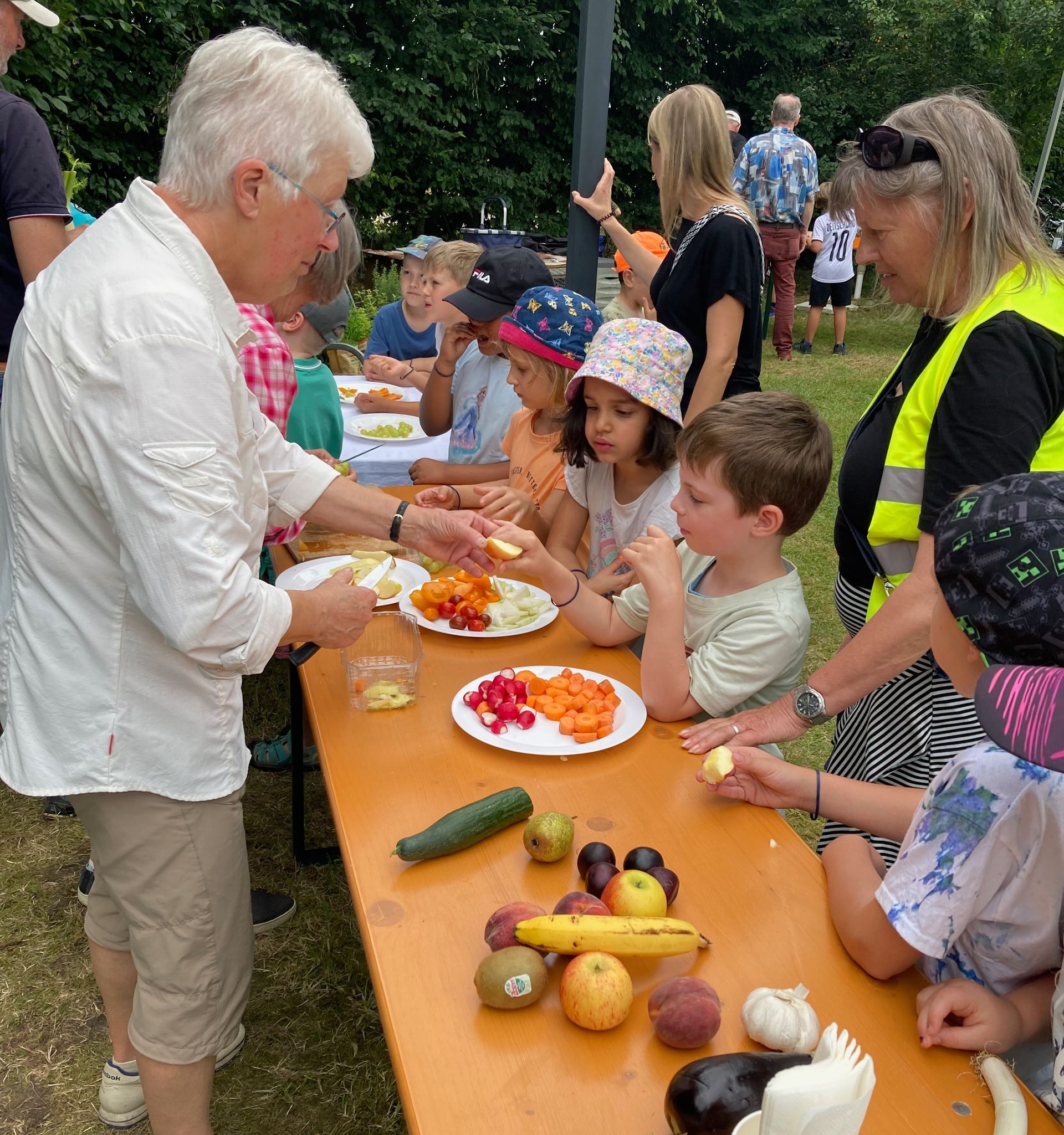 Auch die Verkostung von verschiedensten Kräuter-, Obst- und Gemüsesorten war eingeplant. „Besonders gut schmecken mir die Radieschen“, meinte ein kleines Mädchen, „denn ich esse gern Scharfes!“. Die Kinder lernten auch den Unterschied zwischen Obst und Gemüse kennen. Die Gärtner hatten verschiedene Früchte und Gemüsesorten aufgetischt und erklärten, dass Obst oft süß ist und Samen hat, wie Äpfel und Erdbeeren. Gemüse hingegen sind Pflanzenteile wie Blätter, Wurzeln oder Stängel, wie Karotten oder Salat. Die Kinder fanden es lustig, wie andere das Gesicht verzogen, als sie in saures Obst bissen!