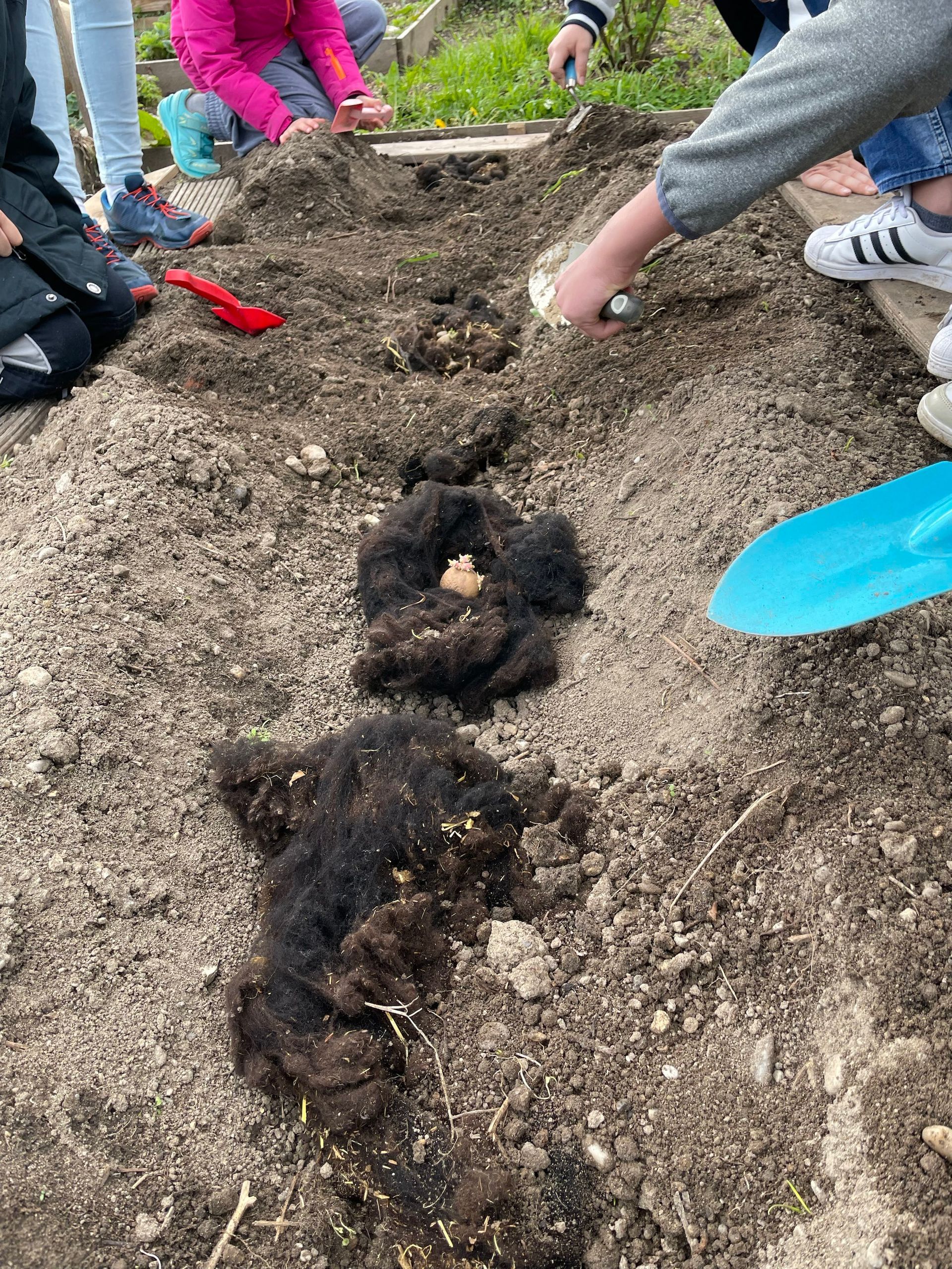 Vor Kurzem gärtnerte die Gruppenstunde der katholischen Kirche mit Helga Widmann nach dem Motto "Schöpfung zum Anfassen" im Gemeinschaftsgarten. Es wurden Kartoffeln gesteckt, Erdbeeren gepflanzt und ein kleiner Blühstreifen angesät. Anschließend pflückte man Pfefferminze für einen Tee zum Aufwärmen.