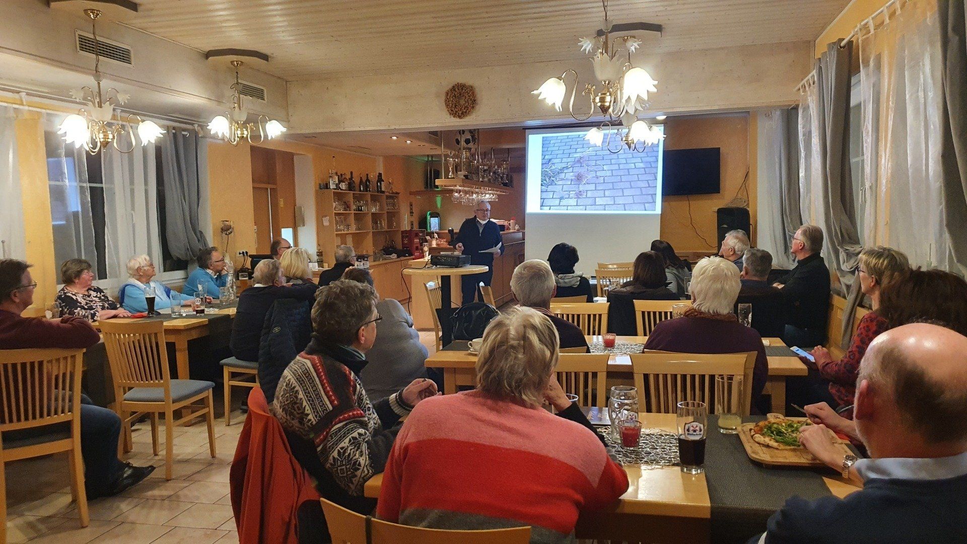 Vor Beginn des Vortrages stand aber die Ehrung verdienter Mitglieder auf dem Plan. Heinz Huber erhielt für 50 Jahre Vereinszugehörigkeit die goldene Ehrennadel mit Kranz und Urkunde verliehen. Anne Fishburn, und Bartholomäus Schweiger erhielten die Ehrennadel mit Urkunde in Gold für 40 Jahre Vereinszugehörigkeit. In Abwesenheit, bzw. in Vertretung wurden Alois Ehrmayr, Max Mühlbauer, sowie Helmut Murr ebenfalls mit der Ehrennadel in Gold und Urkunde ausgezeichnet. Betty Graßl bekam das Ehrenabzeichen in Silber mit Urkunde für 25 Jahre treue Vereinszugehörigkeit.