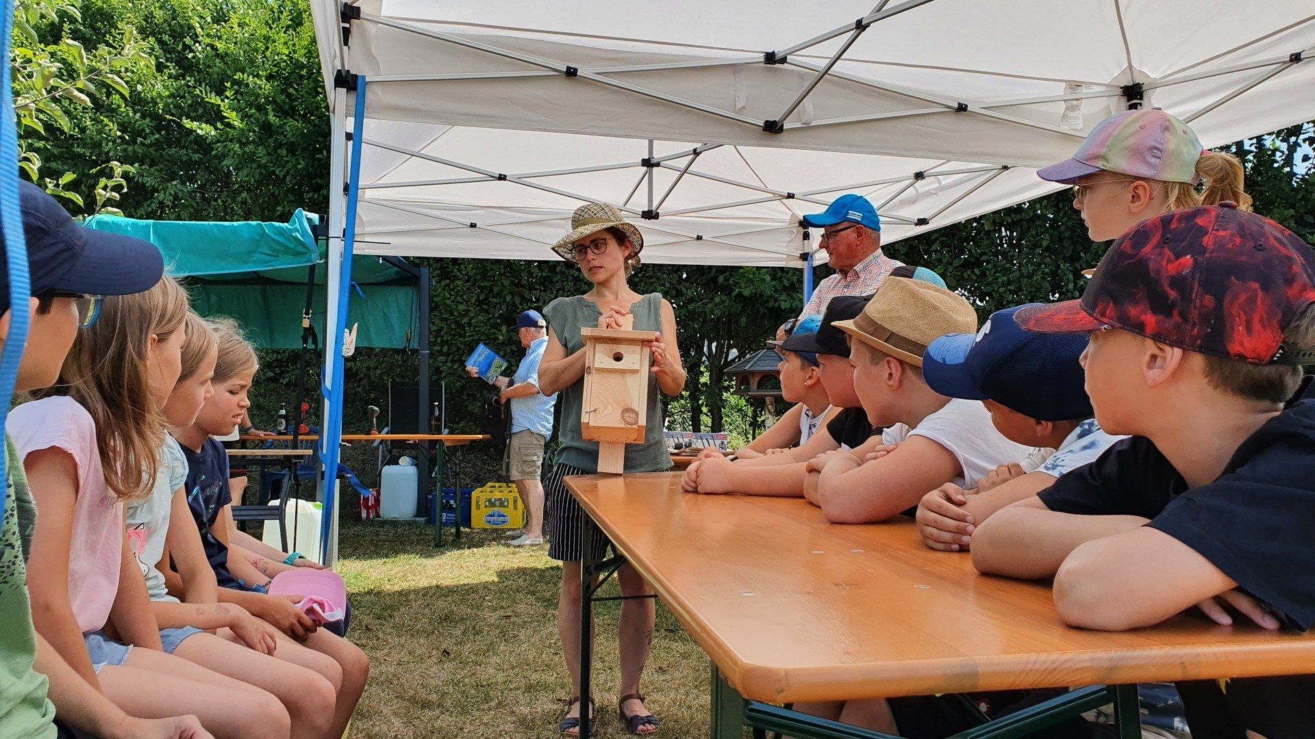 Katrin Möderl erklärt den Kindern, worauf es beim Nistkasten ankommt.