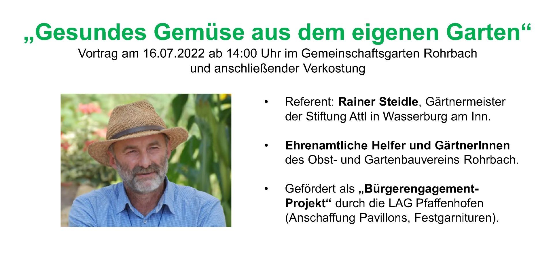 Am 16. Juli 2022 findet zum zweiten Mal ein Sommer-Vortrag im Gemeinschaftsgarten statt. Unter dem Motto „Gesundes Gemüse aus dem eigenen Garten“ zeigt Gärtnermeister Rainer Steidle aus Wasserburg am Inn am praktischen Objekt, wie Gemüseanbau geht. Eine Verkostung gehört mit zum Programm.